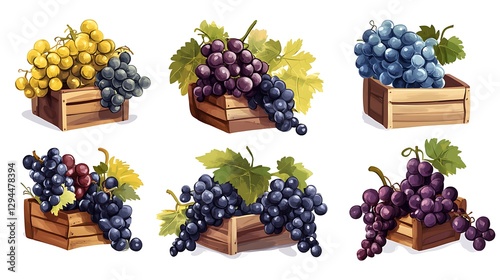 Vibrant Autumn Grape Harvest: A Digital Illustration of Six Wooden Crates Overflowing with Ripe Grapes AI Generated