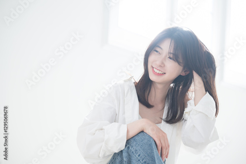逆光の美しい部屋で髪をかき上げる爽やかな女性 ヘアケアや美容やビューティー 見上げる笑顔