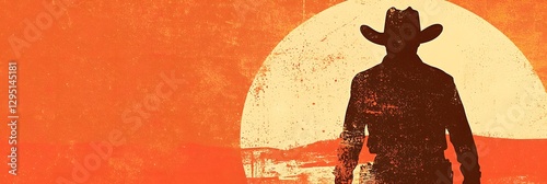 Cowboy silhouette against a golden sunrise walking towards the viewer
