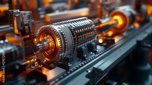 A close-up of an electric vehicle powertrain assembly highlights intricate components and advanced engineering within a modern factory. This showcases the innovation in electric mobility