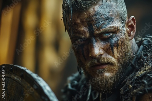 Warrior preparing for battle in an ancient setting with intense expression and warrior markings