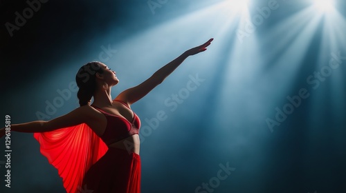 Elegant dancer in red costume performs under dramatic stage lights during a captivating performance at a dance festival