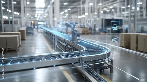 holographic simulation showcasing the inner workings of an automated conveyor system within a futuristic manufacturing plant The visualization highlights the material flow