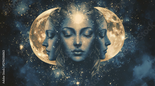 Celestial triple goddess mystical woman moon and stars spiritual art feminine energy. Ethereal Star Goddess. Illustration