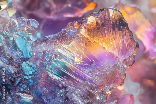 A mesmerizing close-up of iridescent crystal formations showcasing vibrant purple, orange, and blue hues.