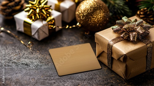 #1144819709Christmas gifts wrapped in gold paper with satin bows are beautifully arranged among pine branches and cones. Ai generated