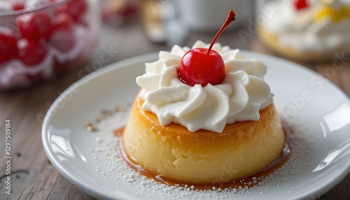 The base is made of golden flan. On top of the flan, spread a liberal layer of fluffy whipped cream with gentle peaks for texture. On top of the whipped cream, add a beautiful red, juicy cherry with