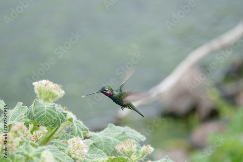 Bico reto de banda branca macho (Heliomaster squamosus) voando para se alimentar da flor do cansanção (urtiga)