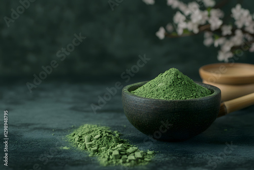 Top view of a macha tea or green tea leaf with copy space, background