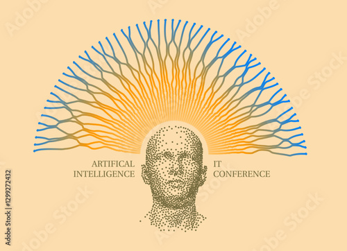 Head of a man above which limbo of branched system of points. Concept of development and concentration of thoughts. The energy of generating ideas. Artificial intelligence. 3D vector for design.