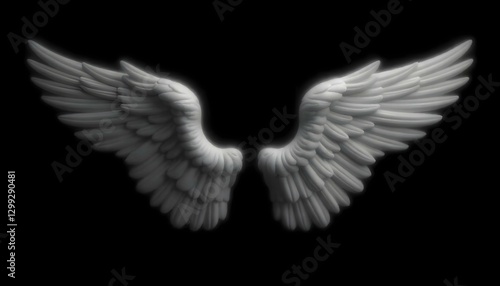 Dos alas de ángel blancas sobre fondo negro, arte digital, iluminación suave y difusa, esquema monocromático, texturas suaves