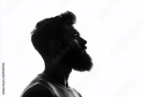 Silueta de un hombre en claro oscuro con barba y pelo sobre fondo blanco