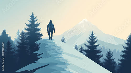 Lone man hikes up a snowy mountain trail, facing away, highlighting solitude and perseverance in a winter landscape. Solitude - Forest. Illustration