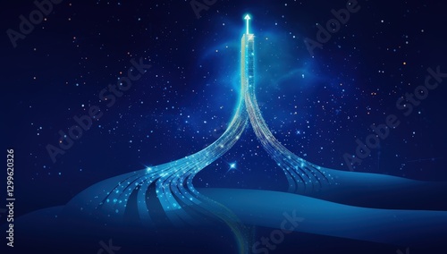 Abstract lines merging and rising into light point in dark sky background. Network concept