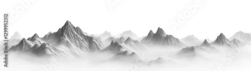 Majestic mountain range with mist covered peaks on white background, Chinese style