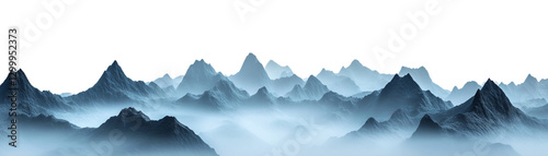 Majestic mountain range with mist covered peaks on white background, Chinese style