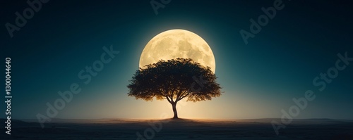 A powerful time-lapse fusion of a full moon rising behind a silhouette of a lone tree, deep blue night sky, shifting clouds, glowing lunar surface, soft cinematic lighting, poetic composition,