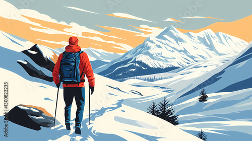 Lone man hikes up a snowy mountain trail, facing away, highlighting solitude and perseverance in a winter landscape. Isolation - Cave. Illustration