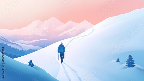 Lone man hikes up a snowy mountain trail, facing away, highlighting solitude and perseverance in a winter landscape. Isolation - Cave. Illustration