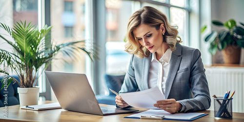 Serious female financier accountant doing paperwork inside office, businesswoman checking contracts and financial reports tax forms, working with documents and laptop