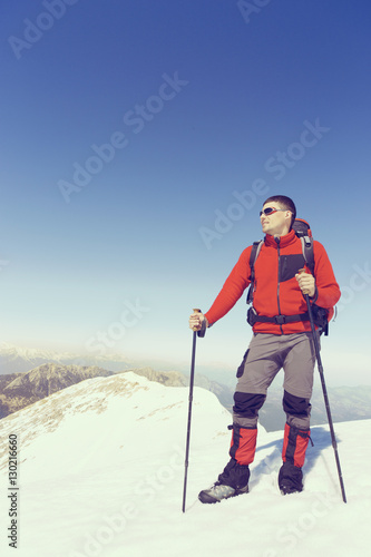 Winter hiking in the mountains with a backpack.