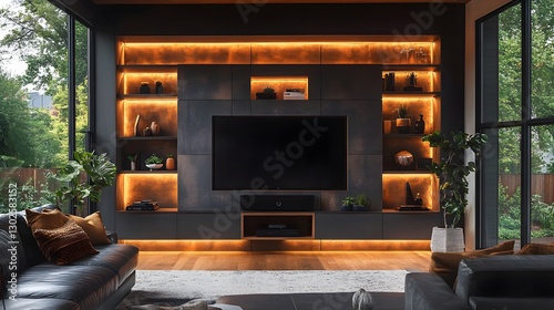 3D modular entertainment center with concealed storage spaces, soft lighting, and a sleek aesthetic