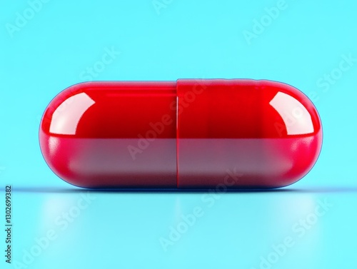 Large red glossy pharmaceutical capsule on clean blue background representing medical treatment healthcare industry and prescription drug concept