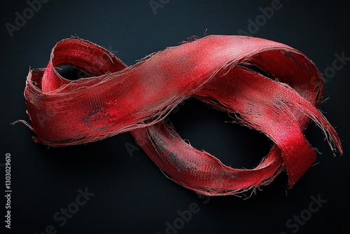 Artistic close-up of red worn ribbon with textured frayed edges against dark background