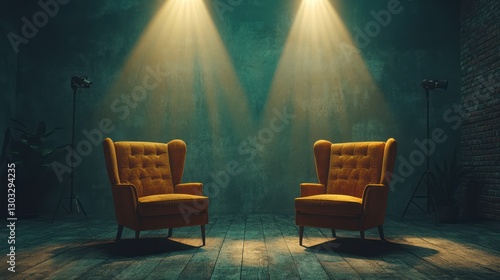 Two mustard yellow wingback chairs in a dimly lit room, ready for a conversation or interview.