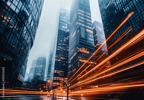 Cityscape with Light Trails: A breathtaking cityscape with skyscrapers piercing the sky. The lights blur into streaks of gold and orange, suggesting motion and the fast pace of urban life.