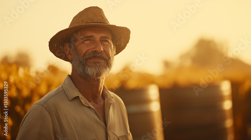 A smiling vineyard farmer in a straw hat enjoys the warmth of the evening sun in a serene rural setting.