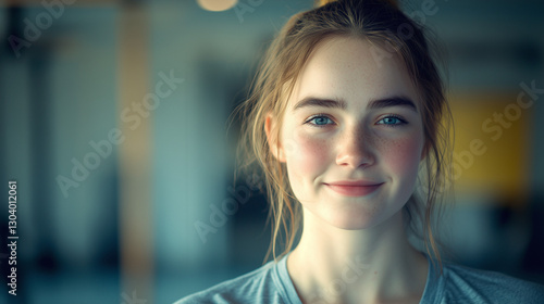 #795896684A confident young woman with long red hair, smiling softly in a modern indoor setting, embodying professionalism and approachability.