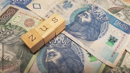 Polish PLN banknotes and ZUS inscription made of letter cubes. Social Insurance Institution