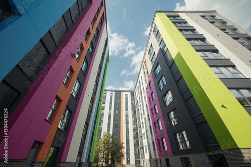 The modern style of architecture is exemplified in the new building facade of the "Green Park. PIK" housing complex, located in Moscow, Russia, serving as a contemporary home in a dormitory area and