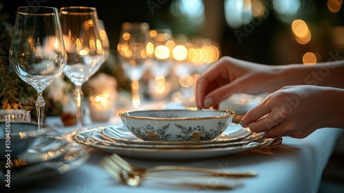 Someone setting a dining table with a bowl and plate featuring a gold rim, handcrafted ceramic plates adding a touch of elegance and warmth, concept of dining, craftsmanship, luxury.