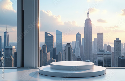 A 3d Podium Is Placed Against A Backdrop Of A Cityscape On The Side Of An Imposing Building.