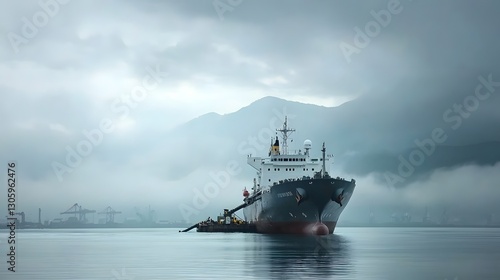 Cargo ship refueling at an industrial harbor with cloudy sky in the background Depicts the logistical and maritime transportation infrastructure involved in the commercial shipping industry