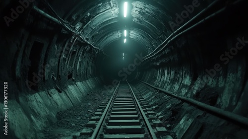 Dark, abandoned subway tunnel, rails leading to light, industrial background, film noir aesthetic