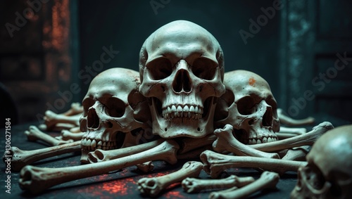 Striking arrangement of three skulls and bones against a dark backdrop in a morgue setting, in Still Life style with selective focus, modified size and color for use as a banner, cover, header, or ...