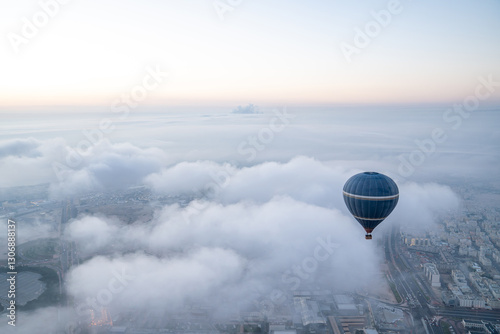 Lot balonem na ogrzane powietrze nad miastem wśród chmur