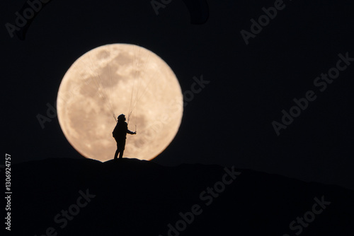 Sylwetka paralotniarza na tle pełni księżyca – nocna fotografia
