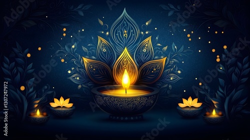 Diwali Lamp Composition featuring Intricately Drawn Golden Diyas Radiating Warm Luminous Light on a Deep Blue Background Evoking the Festive Spirit and Spiritual Essence of the Festival of Lights