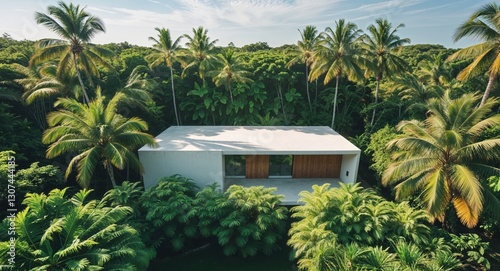 Aerial view of a house surrounded by lush green palm trees and tropical foliage in a dense garden setting