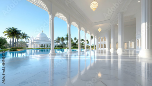 Luxurious white colonnade overlooking a tranquil pool and opulent dome-shaped building, ideal for travel brochures or architectural design websites