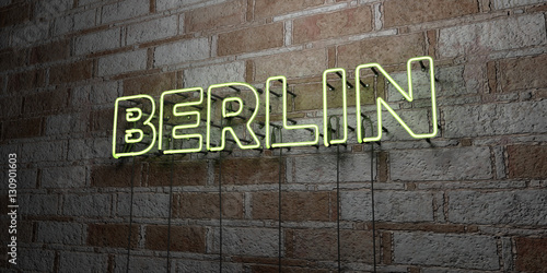BERLIN - Glowing Neon Sign on stonework wall - 3D rendered royalty free stock illustration. Can be used for online banner ads and direct mailers..