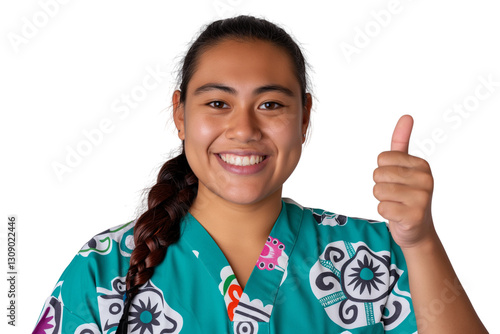 Cheerful young Maori female nurse giving thumbs-up isolated on transparent white background