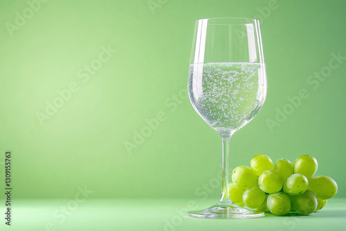 A modern and stylish composition of a glass of sparkling water with fresh green grapes on a pastel green background representing health and freshness