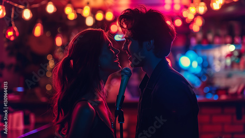This two people share a moment while singing a duet at a lively karaoke night.