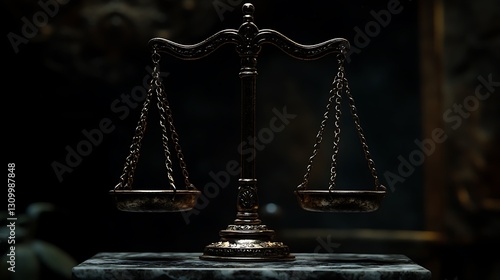 Antique bronze scales of justice in darkened courtroom