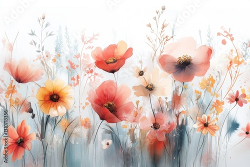 A dreamy watercolor depiction of a meadow glowing under a colorful sunset, with wildflowers and soft shadows adding a romantic touch